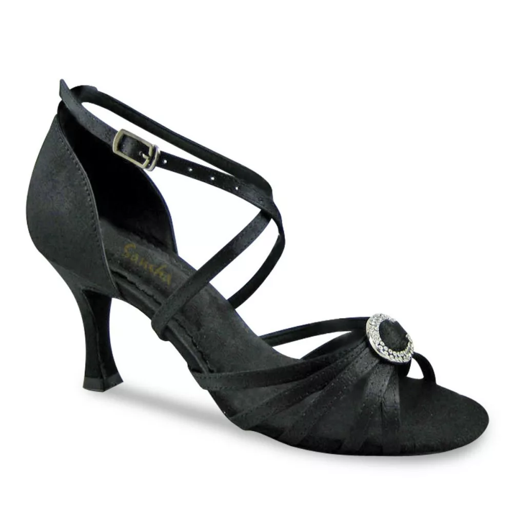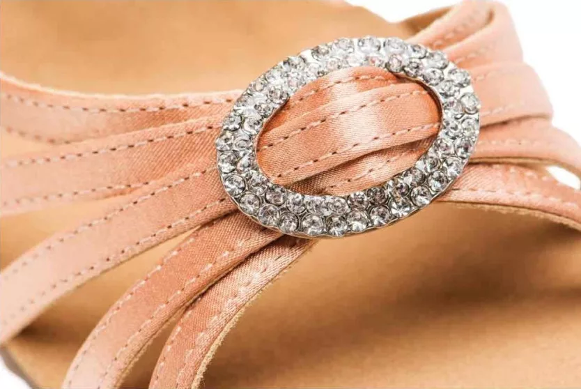 Barbara Lateinschuhe mit Kreuzriemen, verziert mit Strasssteinen. Der obere Teil ist aus hochwertigem Satinmaterial gefertigt, was der Trägerin ein elegantes Aussehen verleiht. Die offene Sandale zeichnet sich durch eine dekorative, mit Strasssteinen verzierte Zehenpartie, eine leicht verstellbare und verbundene Schnellverschlussschnalle, einen dünnen, eleganten Absatz und eine weiche Innensohle aus. Der Träger kann es für lateinamerikanische Tänze, Salsa, Bachata-Kurse, Revuen, Showtänze oder Hochzeiten verwenden.