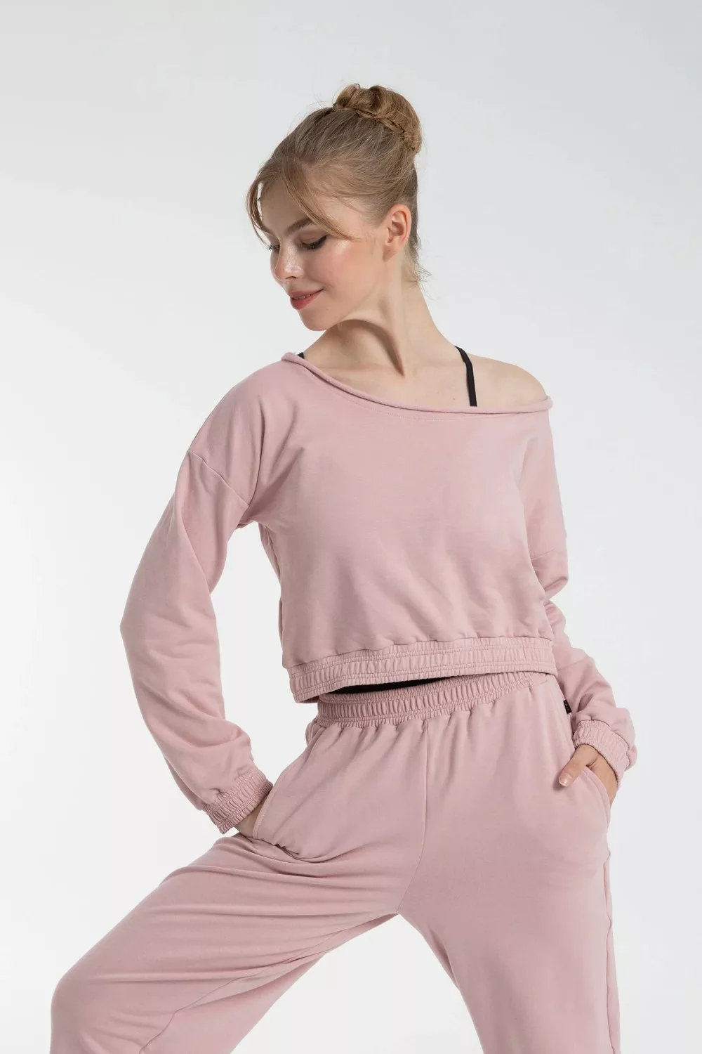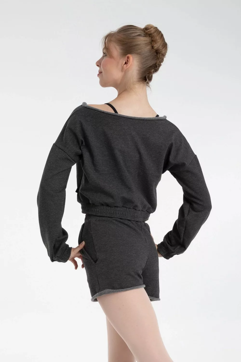 Locker geschnittener, kurzer Baumwollpullover mit flauschiger Innenseite, gummierter Taille und Handgelenken, der Sie vor, während und nach jedem Tanzkurs warm hält. Erhältlich in verschiedenen Größen und Farben.