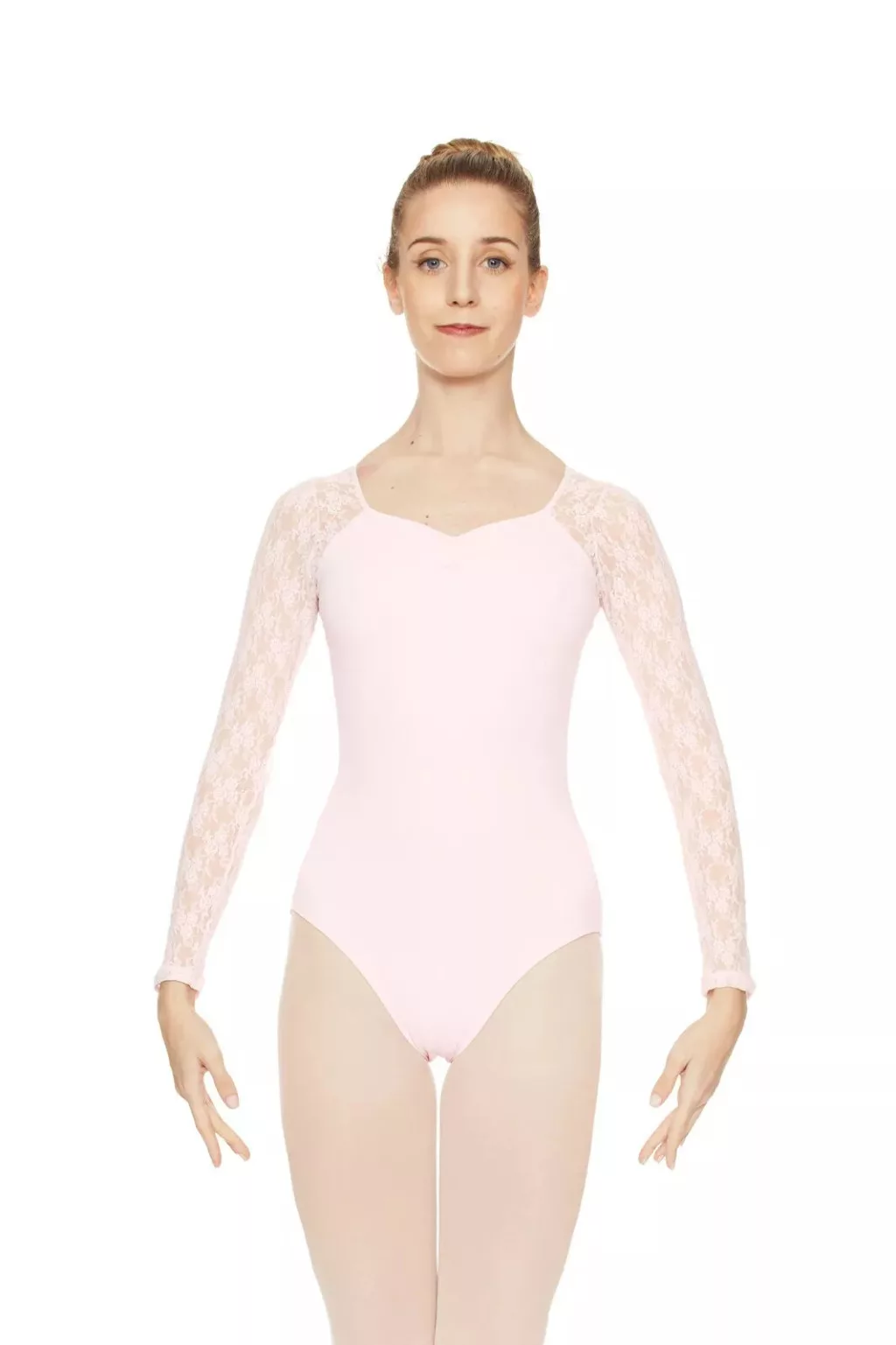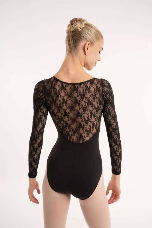Langärmliges Intermezzo-Tanztrikot, dessen Ärmel aus schönem, elastischem Spitzenmaterial bestehen.