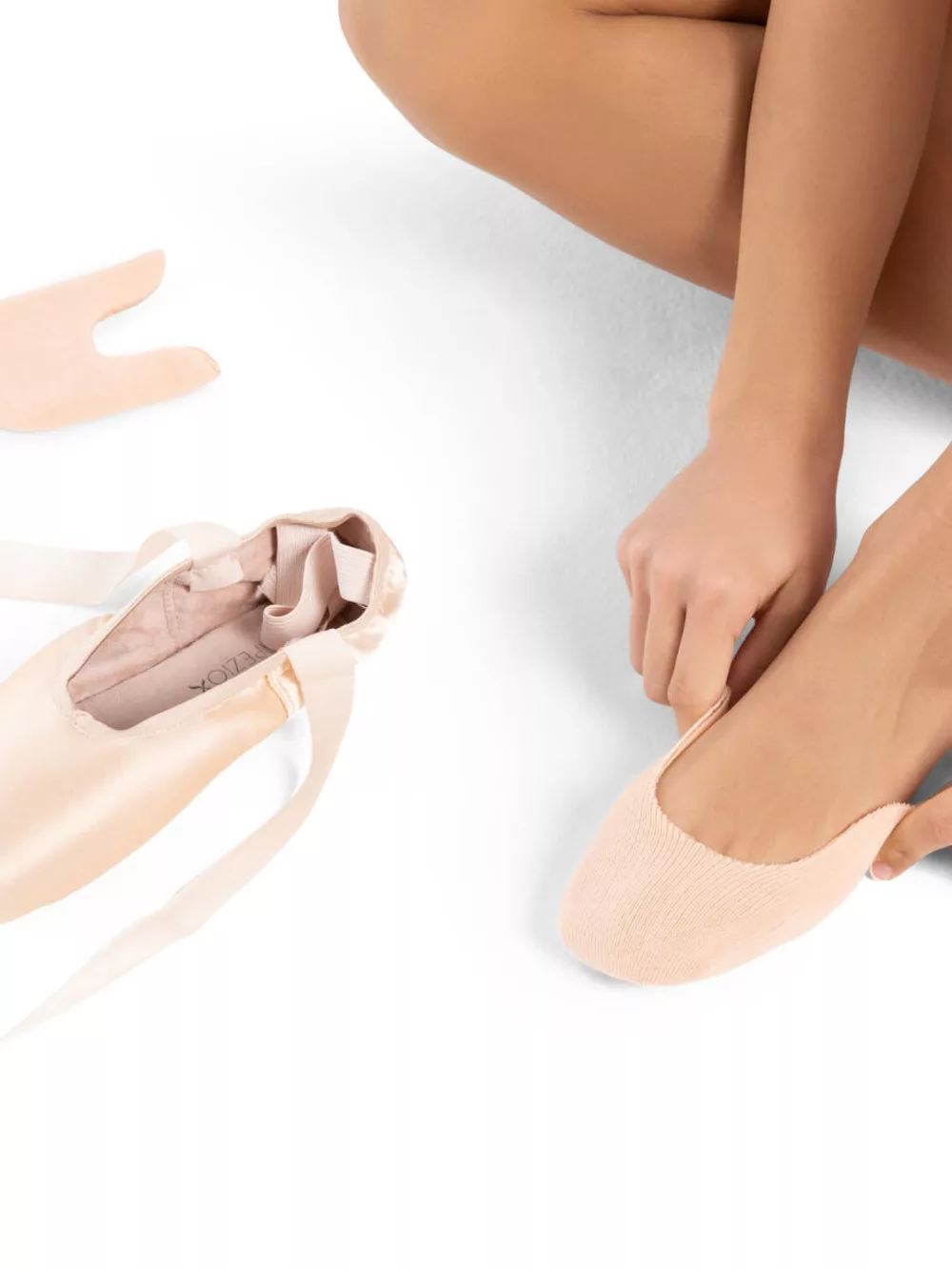 Capezio toe pad with a cotton-spandex mixture material coating on the outside. These pads are designed to reduce pressure on the toes in the en pointe position, making them ideal for long hours of practice. The outer material ensures a comfortable fit, while the softness of the inner gel reduces the pain caused by the load on the toes. The insoles can also be cut to fit perfectly into the shoe.