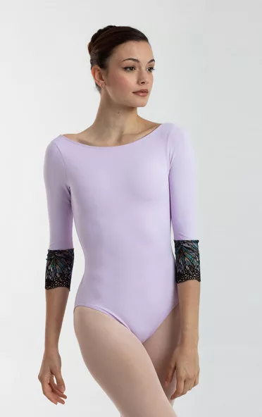 Leotard with boat neck, lace inserts, 3/4 sleeve length. It has a unique lace decoration on the sleeves and back, which makes this simple dress special and elegant. It can be an excellent choice for exams, but it's also a perfect choice for performances or classes if you're looking for something special!