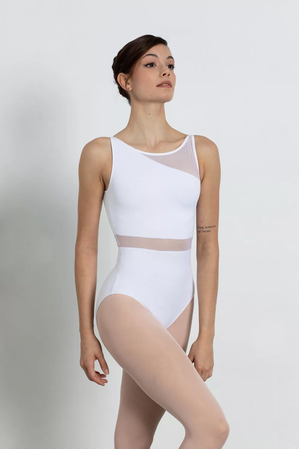 Sleeveless leotard with tulle lining. Thanks to its round neckline, it is comfortable to wear, which is made exciting by tulle inserts in several places. An excellent choice not only for ballet lessons, but also for exams and performances!