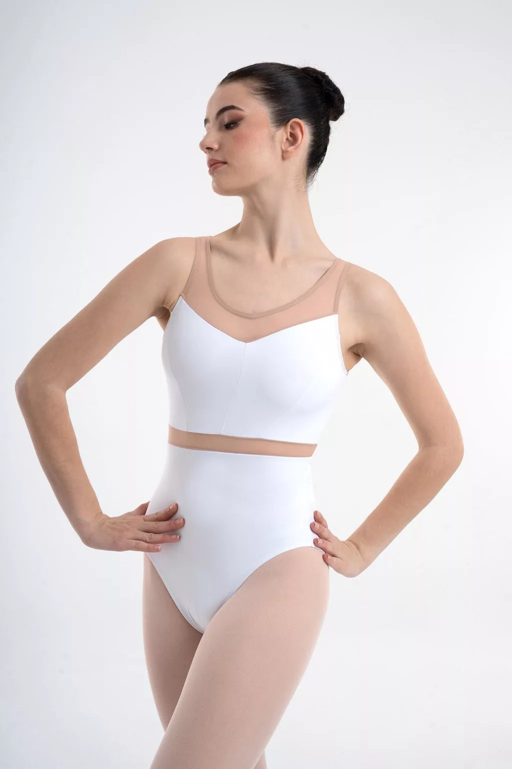 Sleeveless dress with tulle lining. Thanks to its round neckline, it is comfortable to wear, which is made exciting by tulle inserts in several places. An excellent choice not only for ballet lessons, but also for exams and performances!