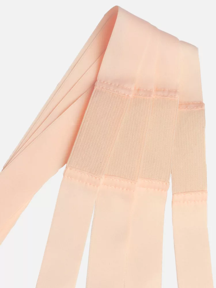 Your feet and ankles deserve some TLC: Tendon Loving Care. Pointe shoe ribbons must tie snuggly to look neat and professional en pointe, but standing flat they can chafe the Achilles tendon. Ouch and sometimes worse. Strategic insertion of elastic makes ribbons comfortable. Ours are super-tidy: ribbon and elastic are the same width and color, meticulously stitched together.