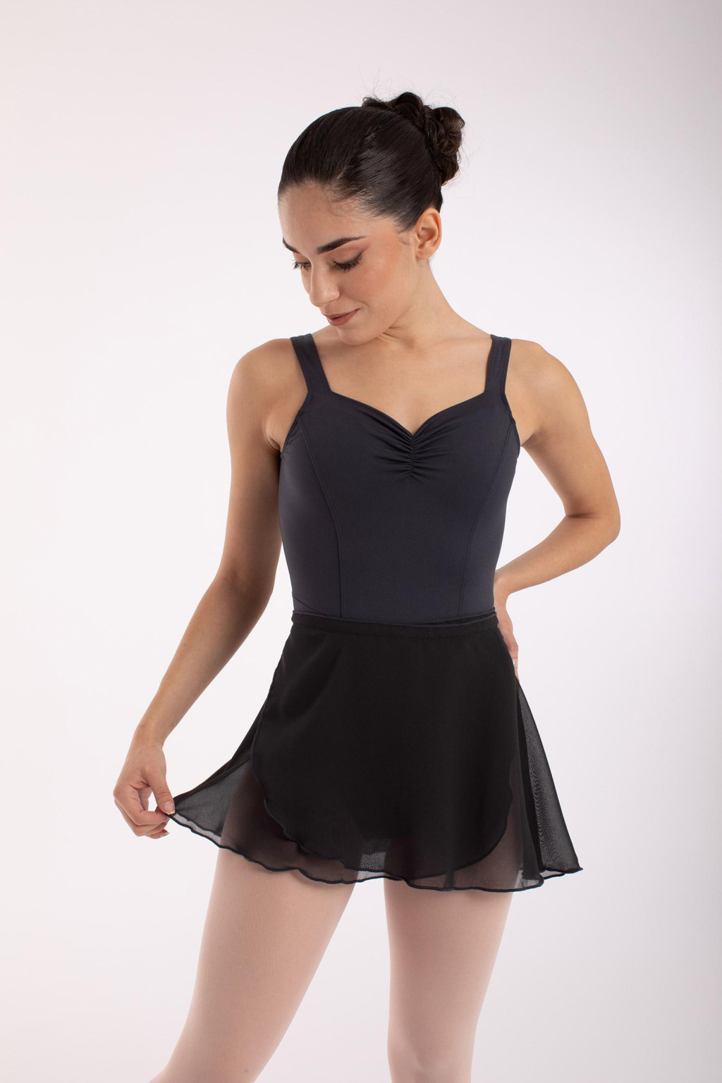Short wrap-over ballet skirt with tie fastening. Soft and semi-opaque fabric. 100% polyamide.