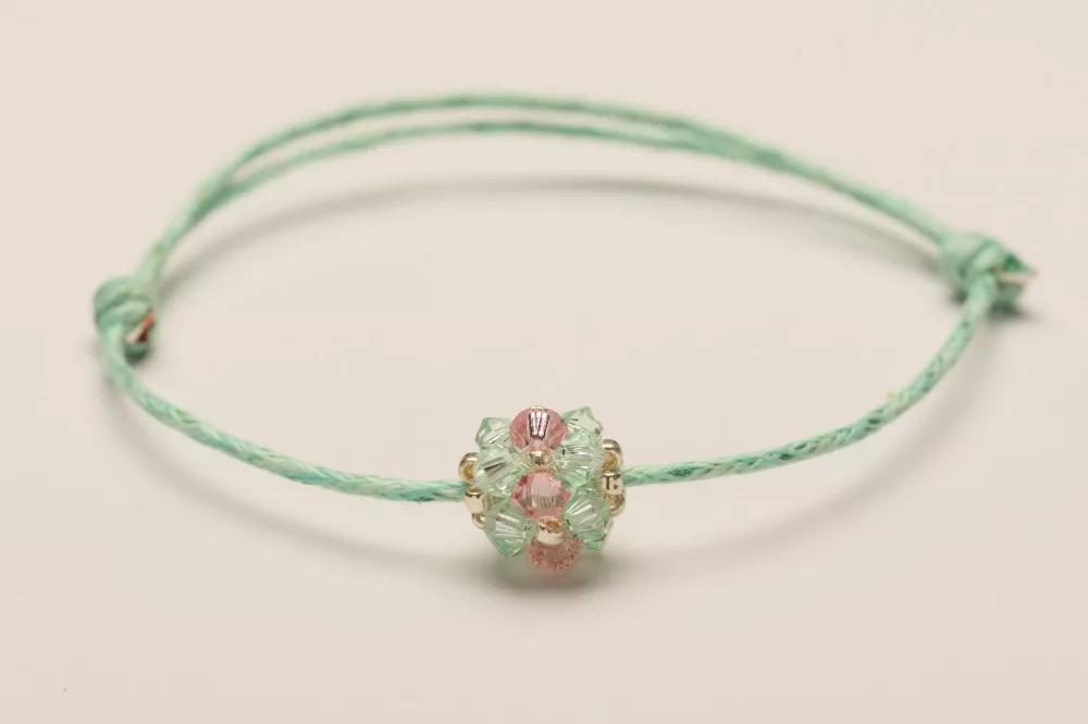 SPARK spherical bracelet, hand-stitched with Swarovski crystals, on waxed cotton thread, with a sliding knot. The jewels of the MACARON collection are inspired by the colors and shapes of the French sweets created by the Cake Shop.