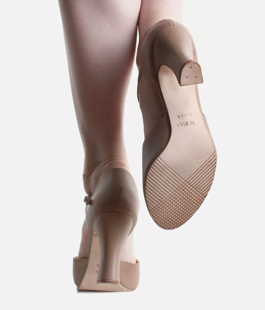 The CH 98 model is a T-strap character shoe with cushioned lining, offering stylish support during long rehearsals. It is designed to provide exceptional comfort for dancers, while the approximately 7.6 cm (3") flared and reinforced heel visually elongates the leg.