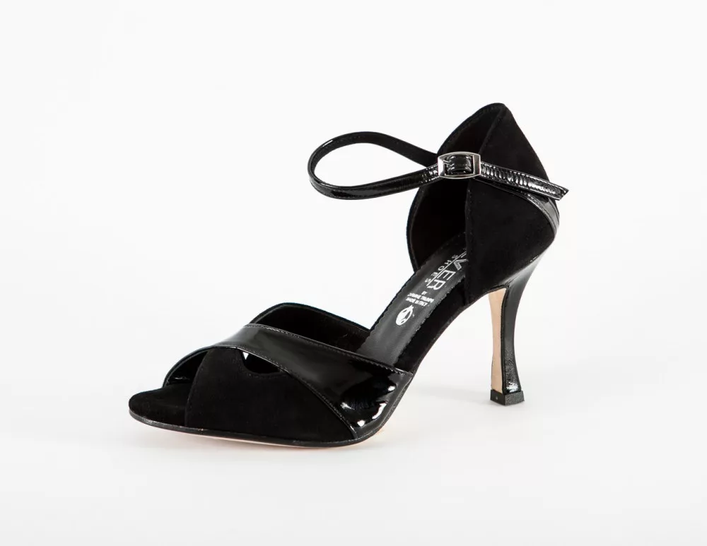 Deer leather toe and heel, elegant ankle strap, easy-to-adjust and connected quick-release buckle, thin heel, soft inner sole characterize these closed-toe tango shoes. The wearer can use them not only as tango shoes, but also for Latin dances, revues, show dances, or weddings.