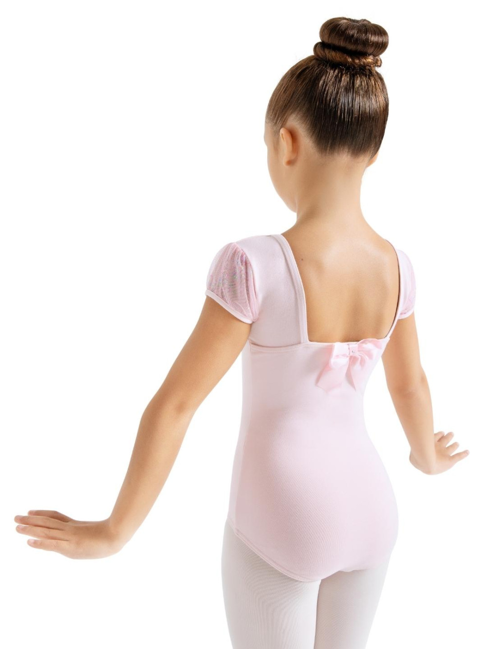 Tricou de balett pentru copii cu mâneci scurte și decolteu rotund. Acest drăguț body micuț a fost făcut special cu o mânecă din tul, care datorită țesăturii sale duble nu irită pielea micilor balerine. O fundă la spate îl face și mai unic. O alegere perfectă pentru orice ocazie!