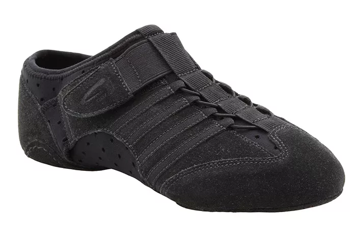 Pantofi de jazz Capezio. Partea superioară este confecționată din piele de căprioară moale și suplă și neopren perforat, ceea ce îi face extrem de ușori, și dispune, de asemenea, de un sistem de laț elastic și de curele Velcro pentru a fi încălțați și scoși rapid și ușor. Talpa este despicată pentru a preveni mișcarea și este confecționată din piele de căprioară, ceea ce îi permite să se rotească bine fără să alunece pe sol.